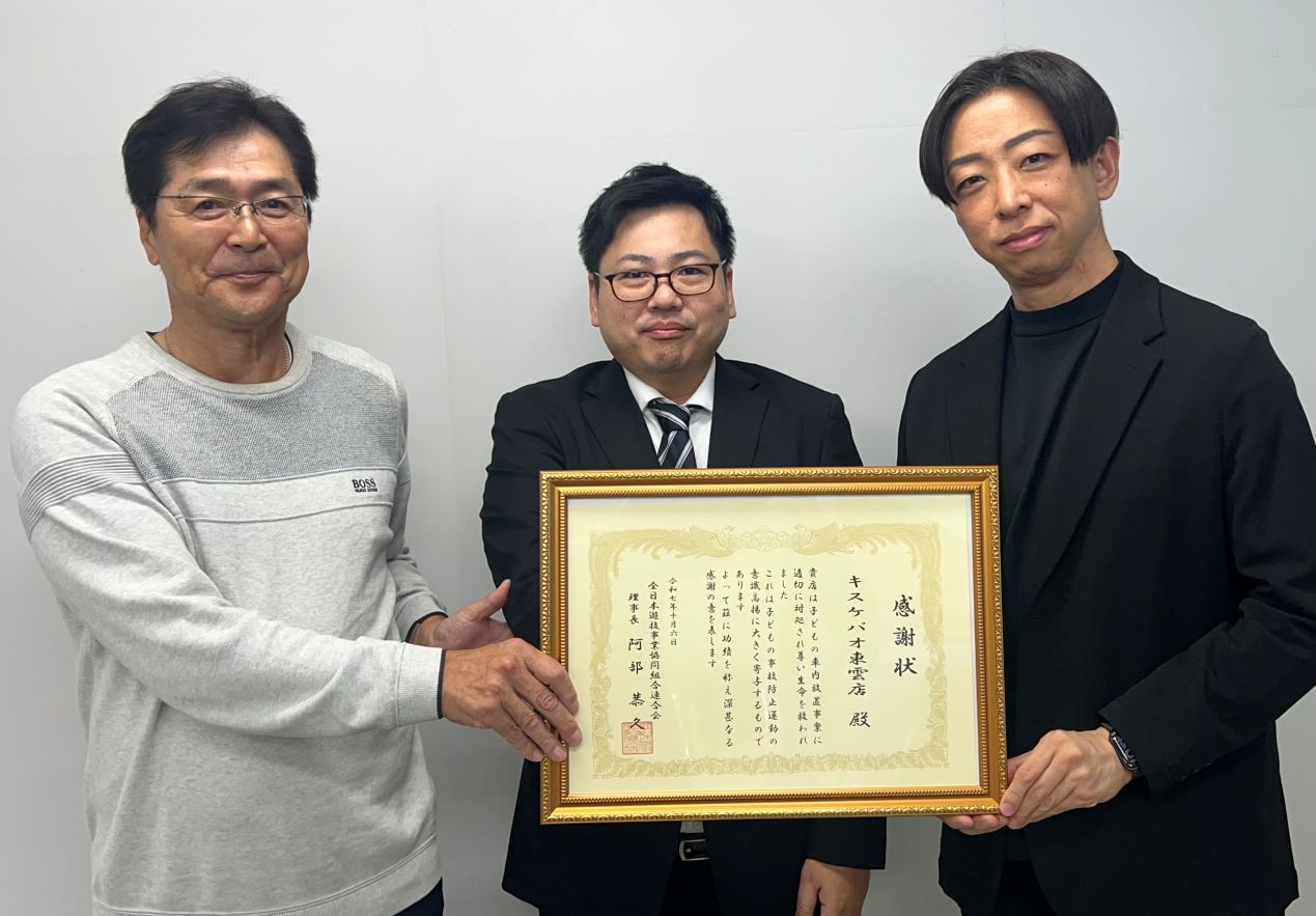 キスケパオ東雲店10月30日、愛媛県遊技業協同組合の事務所において全日本遊技事業協同組合連合会 阿部理事長より感謝状が贈られた。