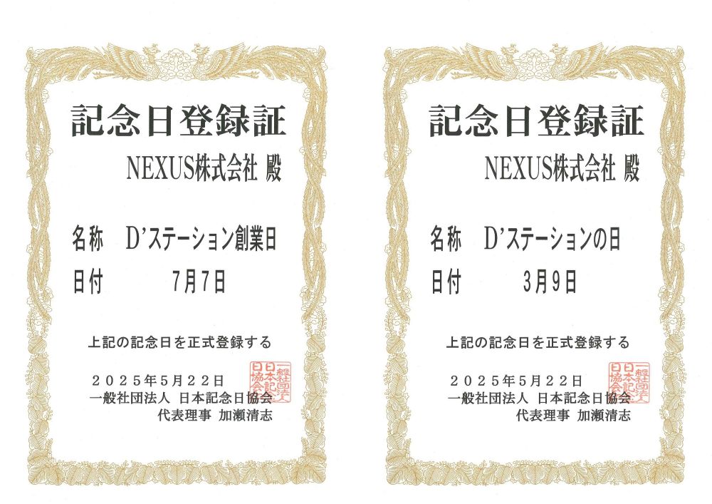 NEXUSは6月2日、「7月7日、D'ステーション創業日」「3月9日、D'ステーションの日」として、日本記念日協会へ記念日を正式登録したことを発表した。