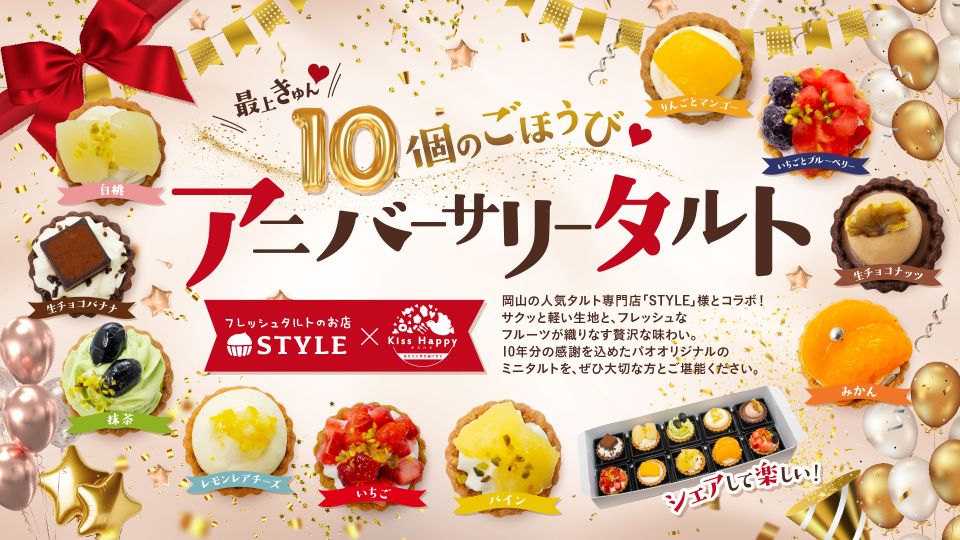 キスケの運営するキスケパオグループは4月25日、フレッシュタルトのお店「STYLE」と共同開発した「10個のごほうび♡ アニバーサリータルト」の取り扱いを開始した。