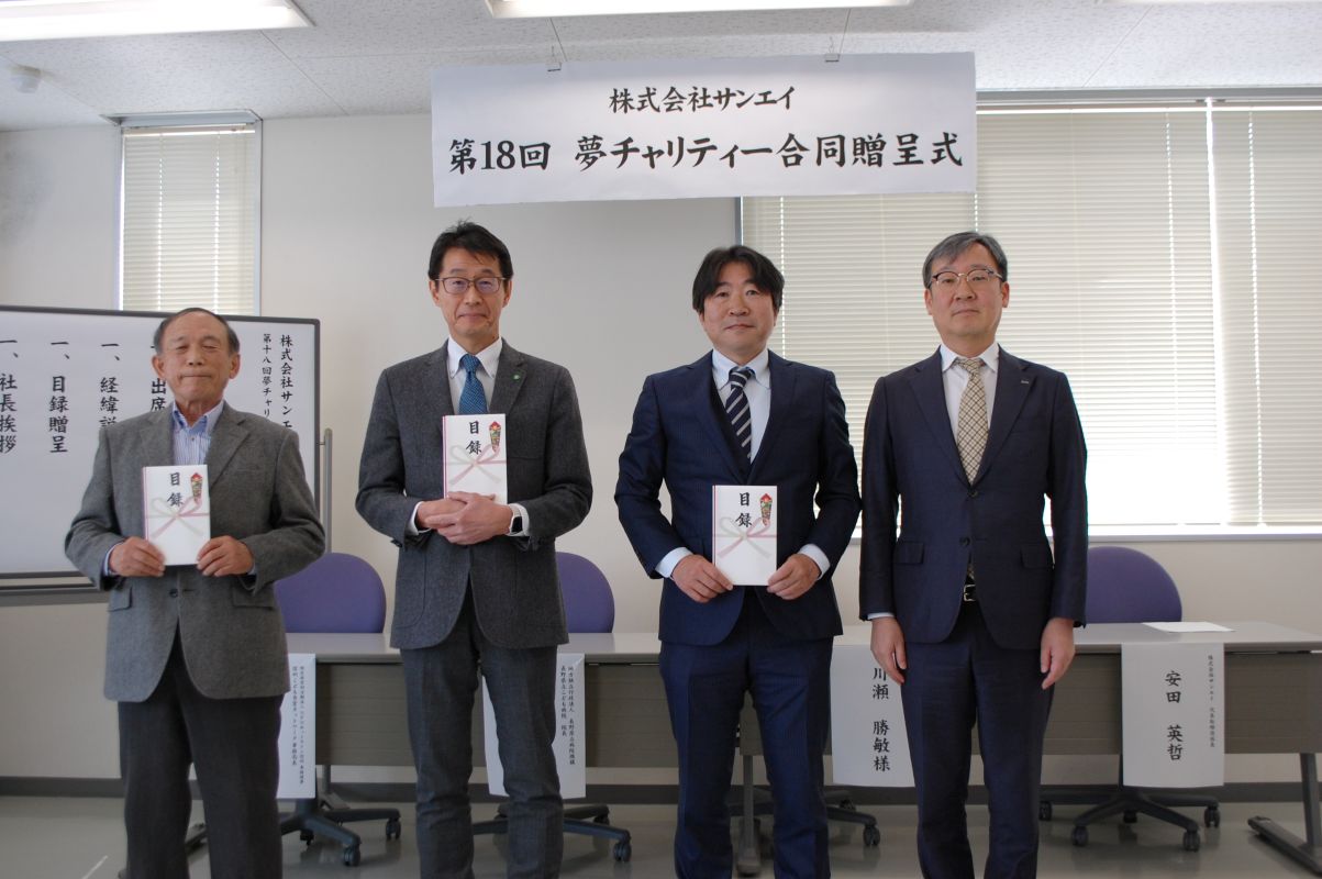 長野県内で「ニュートーキョー」を展開しているサンエイ(安田英哲社長)は3月21日、長野市安茂里の同社会議室で「夢チャリティ3団体合同寄付贈呈式」を開催し、児童福祉施設など3団体に合計500万円を寄付した。