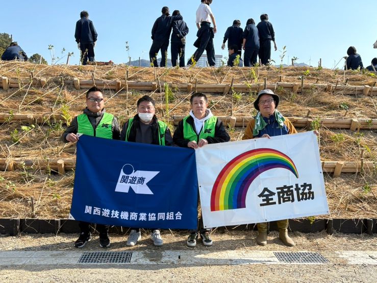 全商協傘下の関西遊技機商業協同組合は3月20日、和歌山県広川町で行われた鎮守の森のプロジェクト 和歌山県広川町「稲むらの火といのちを守る植樹祭」に参加した。