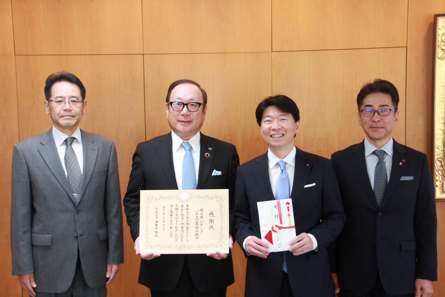 岡山県パチンコ・パチスロ業協同組合は12月26日、県内の社会福祉施設を整備する際の財源として活用される「岡山県桃太郎愛のともしび基金」に100万円を寄付した。