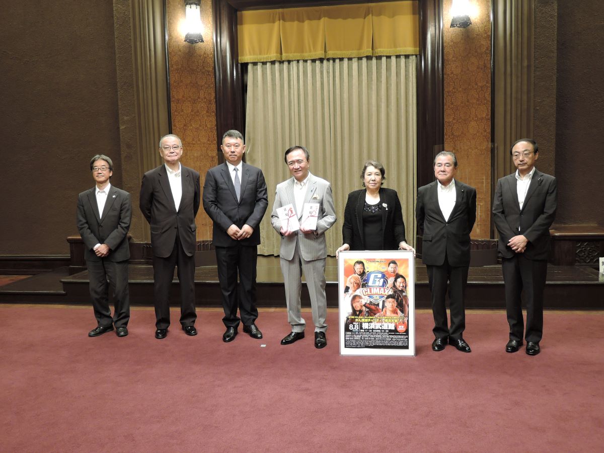 神奈川県遊技場協同組合(伊坂重憲理事長)と神奈川福祉事業協会(同会長)は7月2日、神奈川県庁で新日本プロレス・がん撲滅チャリティー試合の入場券100枚の寄贈式を行った。