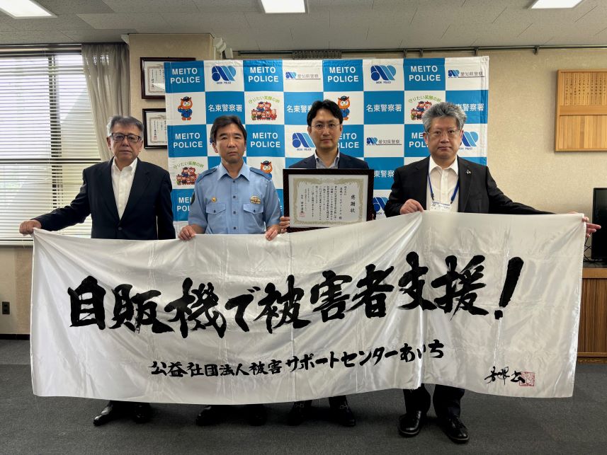 愛知、岐阜で店舗展開する真城ホールディングスはこのぼど、同社が運営する「プレイランドキャッスル上社店」に寄付金付き自動販売機を設置したことに対し、名東警察署の署長室において感謝状を受領した。