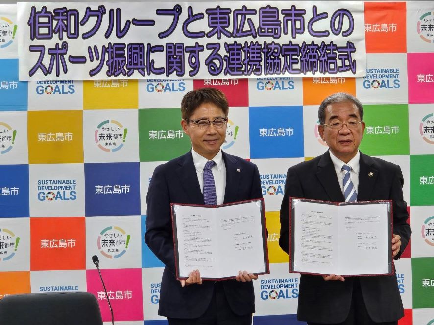 広島県遊技業防犯協力会連合会員である伯和グループ(安本政基代表取締役社長)は、東広島市とスポーツ振興に関する連携協定を結び、6月14日に東広島市役所で連携協定締結式を行った。