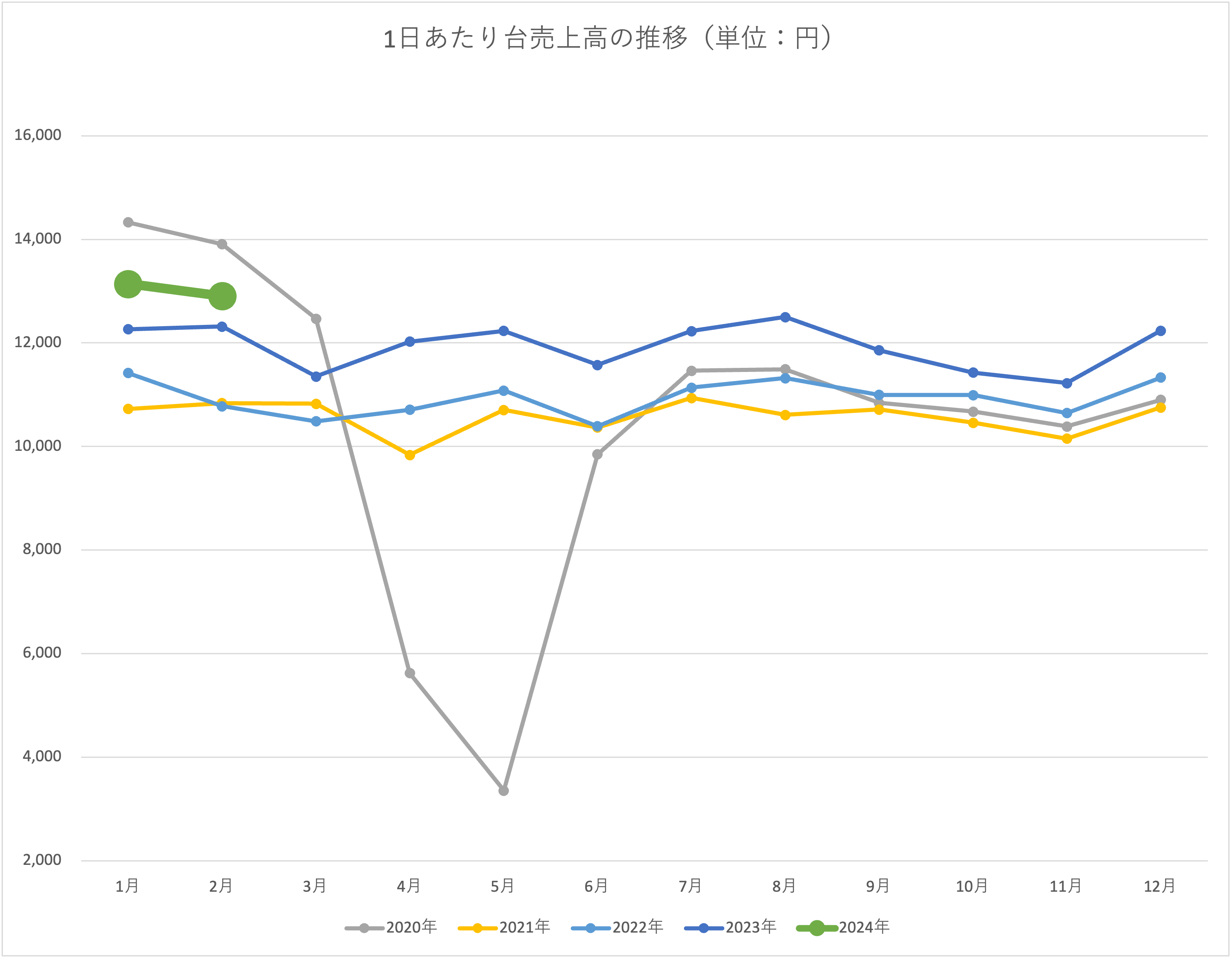 1日あたり台売上高は前月比232円減の12,908円を示し、13,000円台を割ったものの高水準をキープした。なお1店舗あたりの従業員数は前…