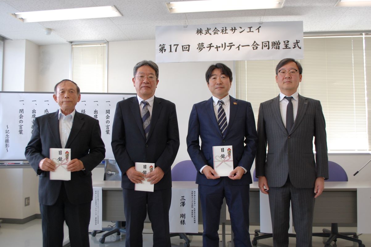 長野県内で「ニュートーキョー」を展開しているサンエイ(安田英哲社長)は3月29日、長野市安茂里の同社会議室で「夢チャリティ3団体合同寄付贈呈式」を開催し、児童福祉施設など3団体に合計500万円を寄付した。