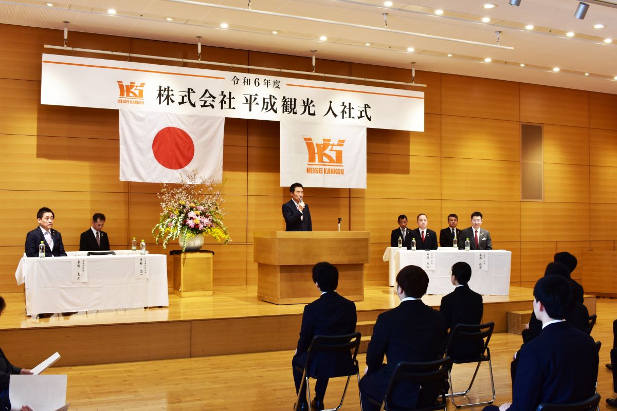 平成観光の令和6年度入社式が4月1日、多治見市のセラミックパークMINO国際会議場で行われ、新入社員13名(男性10名、女性3名)が出席した。