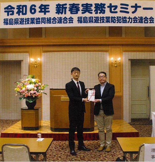 福島県遊連青年部は2月14日、福島市のグリーンパレスで開催した県遊連の新春実務セミナーの席上で、青年部の劉潤哲副会長が「ふくしま子ども食堂ネットワーク」の江川和弥代表に活動助成金10万円を贈呈した。