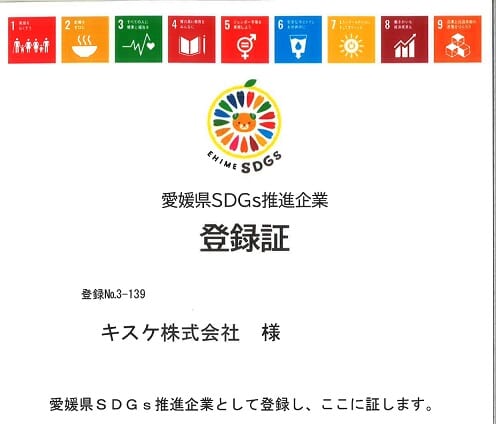 愛媛県のホール企業・キスケは8月1日、愛媛県が創設した「 愛媛県 SDGs 推進企業」の登録を更新したことを発表した。