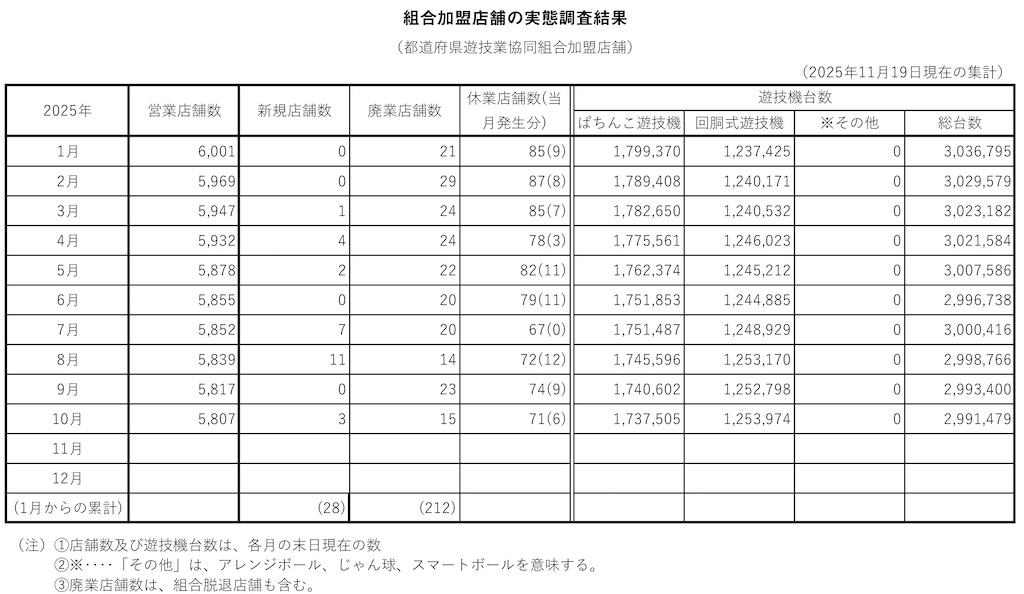 全日本遊技事業協同組合連合会(全日遊連、阿部恭久理事長)はこのほど、組合加盟店舗の実態調査結果(11月19日現在)を発表した。