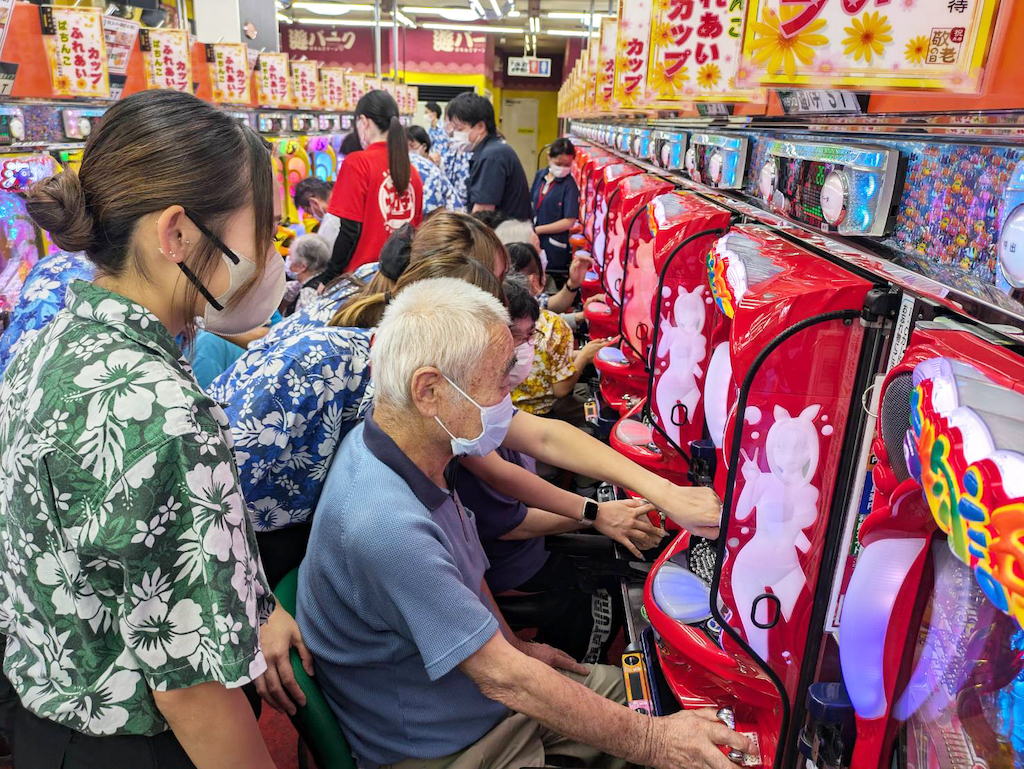 長野県内にグループ展開するサンティア(本社・長野県諏訪市)は9月18日、諏訪市富士見町の「遊パーク富士見店」で、特別養護老人ホームの利用者約40名を招いてパチンコ無料招待を開催した。
