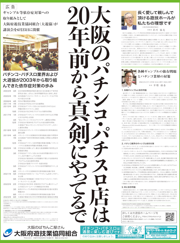 大阪府遊技業協同組合(大遊協、平川容志理事長)は7月初旬、西日本エリア版の新聞3紙(毎日新聞、産経新聞、朝日新聞)の朝刊に、大遊協が取り組む依存症対策をテーマにした全面広告を掲載した。