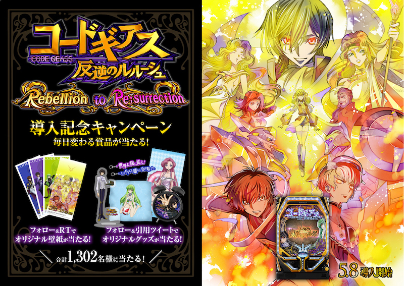 フィールズは、新機種「Pコードギアス 反逆のルルーシュ Rebellion to Re;surrection」(ビスティ製)の導入を記念し、5月7日(日)から21日(日)までキャンペーンを実施する。