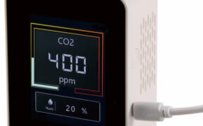 「二酸化炭素濃度チェッカー」は、換気の目安にもなる濃度測定器。CO2と湿度を計測し、約1秒ごとにリアルタイム更新する。CO2の濃度に応じて画面が4段階に変化するため、数値と色で換気のタイミングがわかる。本体サイズは70×…
