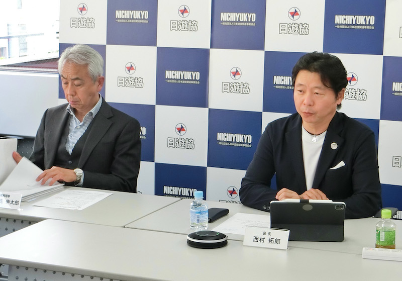 日遊協は5月14日、都内中央区の本部会議室において定例理事会を開催。その後リモートを併用した記者会見が行われ、西村拓郎会長、御手洗伸太郎専務理事が出席した。