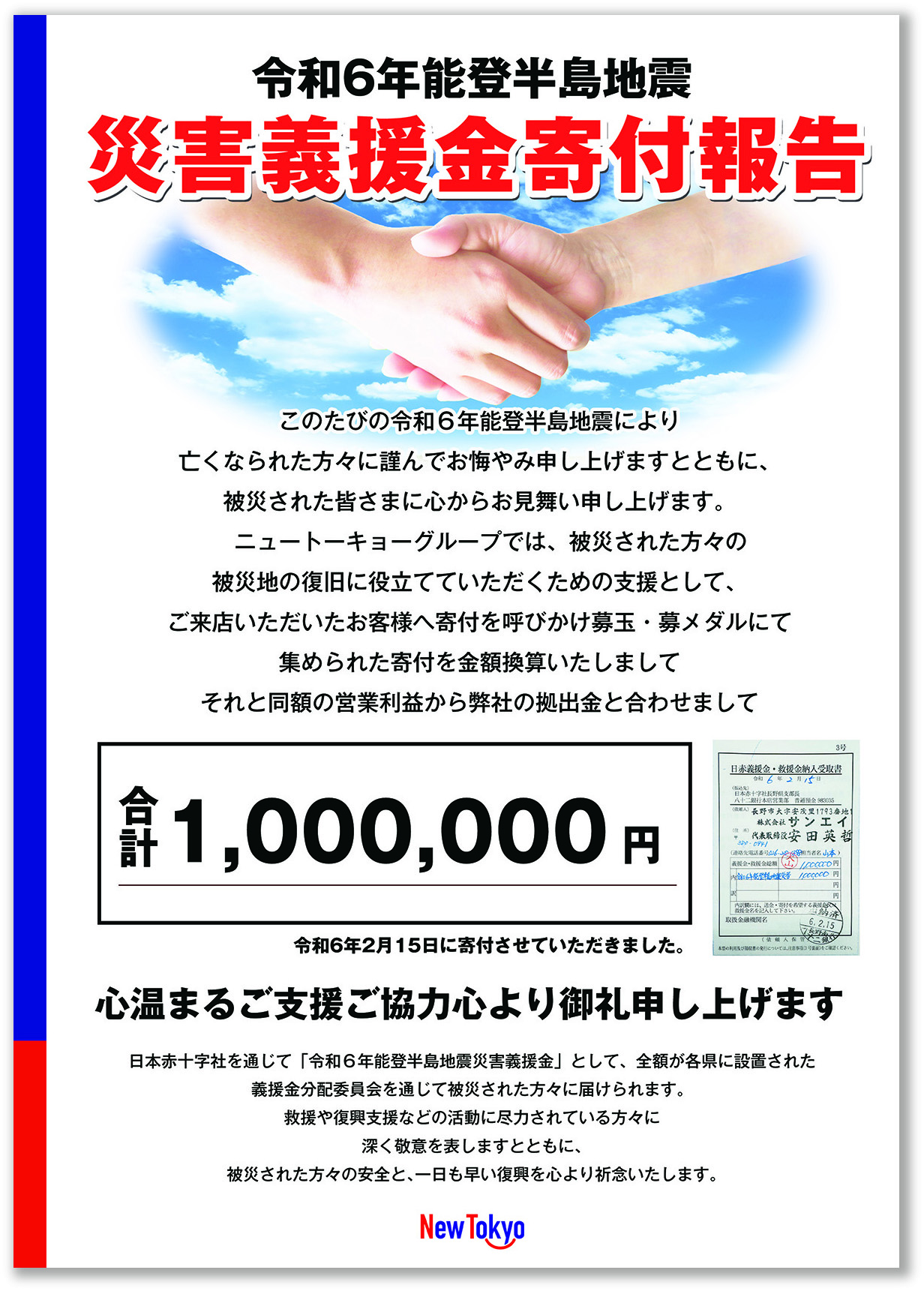 長野県内で「ニュートーキョー」を展開しているサンエイ(安田英哲社長)は2月15日、令和6年能登半島地震の被災地支援として来店客に寄付を呼びかけ、募玉・募メダルで集められた寄付を金額換算。それと同額の営業利益から同社の…