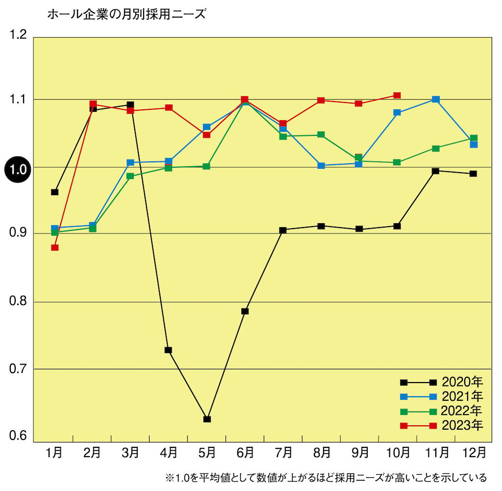 パチンコ業界に特化した人材採用支援を行うパック・エックスが、ホール企業の採用意欲について毎月まとめている「パチンコホール企業の転職市場状況」によると、2023年10月の採用ニーズは基準値を上回る1.11ポイントだったこと…