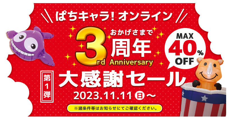 各種ホール向け賞品の企画開発・販売を行う大宏は、同社が運営するECサイト「ぱちキャラオンライン」が、11月11日でオープンから3周年を迎えることから、記念セールやプレゼント企画などのイベントを実施している。