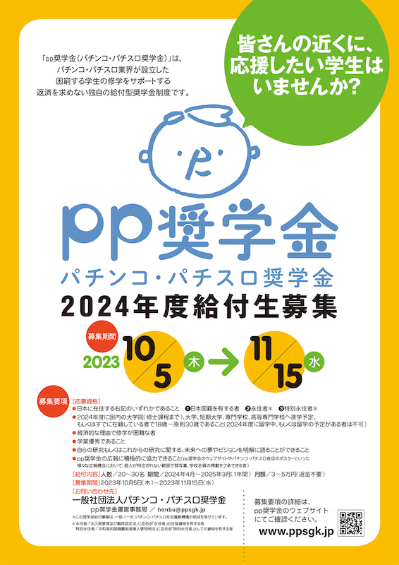 一般社団法人パチンコ・パチスロ奨学金(pp奨学金)は、10月5日から2024年度給付希望者の募集を開始した。