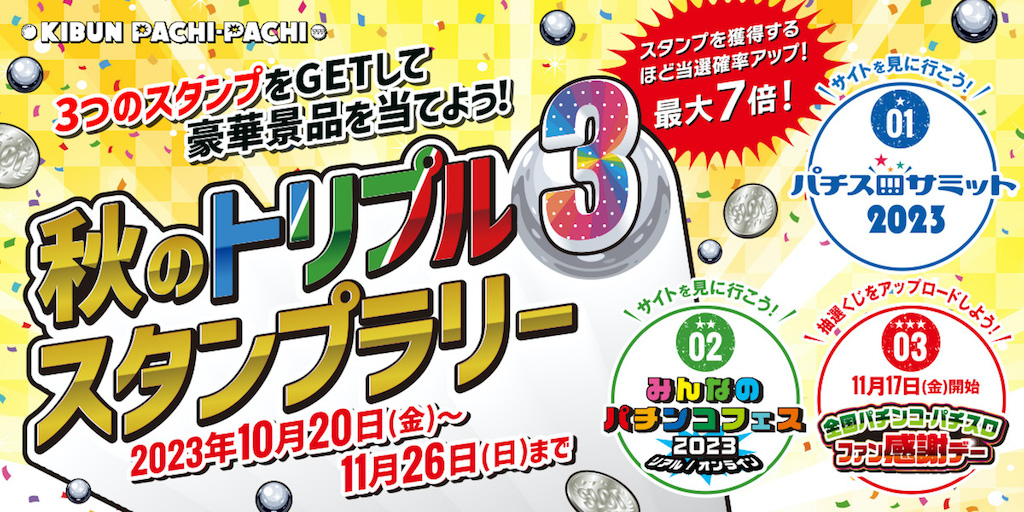 日本遊技機工業組合(略称:日工組)は、10月20日から11月26日まで「KIBUN PACHI-PACHI 秋のトリプルスタンプラリー」を開催する。