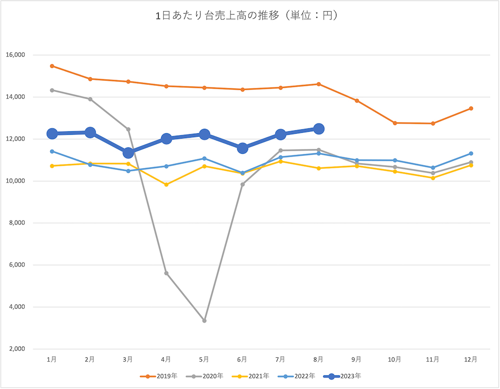 1日あたり台売上高は今年最高値の12,501円を示し、12,500円を上回ったのは13,907円の2020年2月以来40カ月ぶり。対前年…