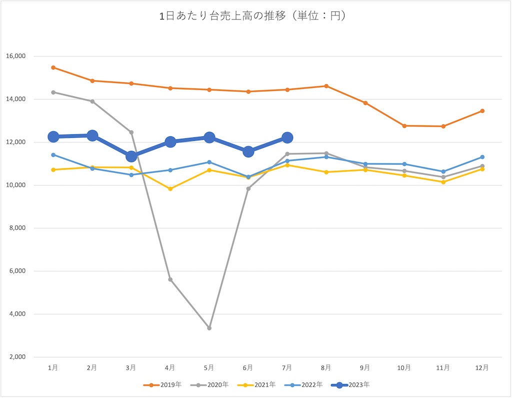 経済産業省はこのほど、2023年7月期の特定サービス産業動態統計を発表した。1日あたり台売上高は12,227円で、2カ月ぶりに12,000円台へ戻っている。