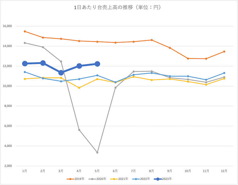 経済産業省はこのほど、2023年5月期の特定サービス産業動態統計を発表した。1日あたり台売上高は12,233円で、12,000円台をキープしている。