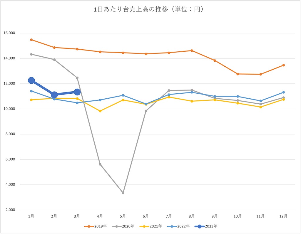 経済産業省はこのほど、2023年3月期の特定サービス産業動態統計を発表した。1日あたり台売上高は11,352円で、昨年12月から続く11,000円台(1月は12,000円台)をキープした。