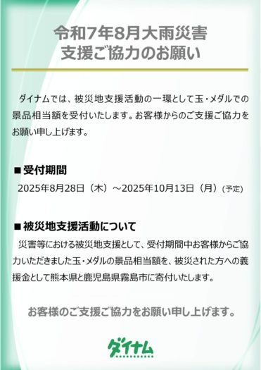全国46都道府県にパチンコホールを展開するダイナムは8月28日、令和7年8月大雨災害で被災された方々への支援を目的として、ダイナムの店舗において玉・メダルによる義援金の受付を実施することを発表した。